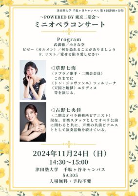 11月23・24日、津田塾大学千駄ヶ谷キャンパスでは津田ヶ谷祭が行われ、梅五輪オペラワーキンググループでは二期会オペラの展示ブースを開きました。11月24日にはオペラ歌手の草野七海さんとピアニストの古野七央佳さんをお迎えし、コンサートを行いました。